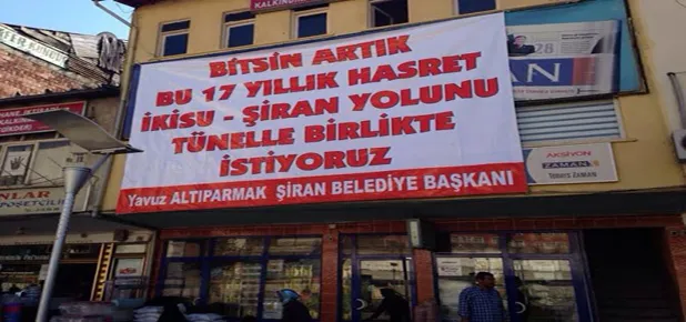 Belediye Başkanı Yavuz Altıparmak tarafından ilçe meydanına astırılan ve Şiranlı gençler tarafından taşınan pankart, 17 yıldır tamamlanamayan Şiran-ikisu karayolunun tamamlanması yönündeki istekti.