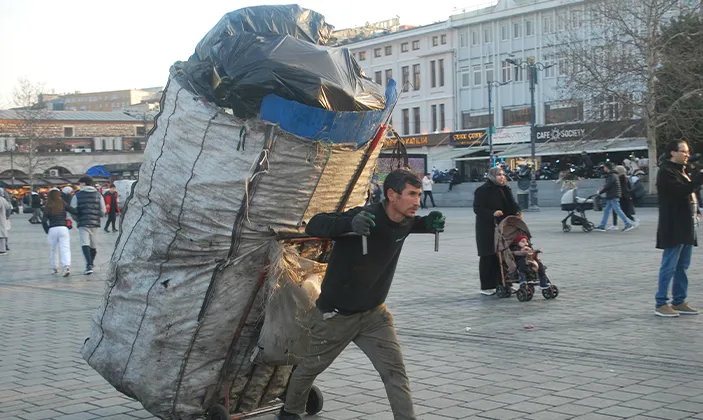 Eminönü’nün hareketli sokaklarında yaşam mücadelesi veren bir emekçinin hikayesi, Gündoğumu Gazetesi objektiflerine yansıdı. Sırtında devasa yüklerle kağıt, plastik ve karton taşıyan bu kişi, hayatın ağır şartlarına karşı direnen milyonların simgesi gibi.