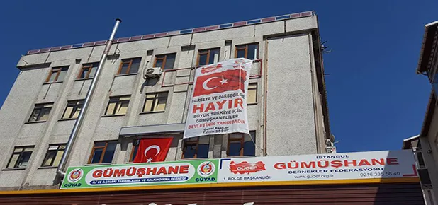 Derneğin Ümraniye ilçesinde bulunan genel merkezine dev bir pankart asarak tepkisini dile getiren yönetimin, ‘Darbe ve darbecilere hayır. Gümüşhaneliler devletinin yanındadır’ sözleri dikkat çekti.