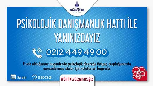 İstanbul Büyükşehir Belediyesi “Psikolojik Danışmanlık Hattı” haftanın 7 günü 08.00 ile 24.00 saatleri arasında 0 (212) 449 49 00 numarası üzerinden İstanbullulara hizmet verecek. Hattı arayan yurttaşlar pandemi sonucu oluşan sendromlar, sosyal izolasyon ve stres kaynaklı sorunlarla ilgili destek alabilecekler.