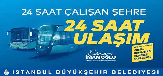 İBB Başkanı İmamoğlu’nun, “Bu şehir 24 saat yaşıyor” diyerek İstanbullulara müjdesini verdiği “İstanbul'da 24 Saat Ulaşım” dönemi, 30 Ağustos Zafer Bayramı gecesi başlıyor. Yeni uygulama ile İstanbul, dünyada hafta sonları gece metro hizmeti veren sekiz metropelden biri olacak. Kentteki en yoğun kullanılan 6 metro hattı artık, resmi tatiller, dini bayramlar ve hafta sonlarında olmak üzere 24 saat boyunca İstanbullular için çalışacak. Başlatılan bu yeni uygulama çerçevesinde ilk etapta İstanbullulara hizmet verecek gece ulaşım hatları şunlar: