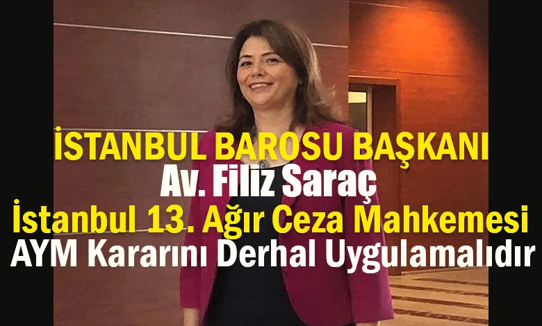 Anayasa Mahkemesi’nin Hatay Milletvekili Av. Şerafettin Can Atalay’ın tutukluluk halinin hak ihlali olarak değerlendirmesinin ardından tahliye edilmemesine İstanbul Barosu Başkanı Av. Filiz Saraç tepki gösterdi.