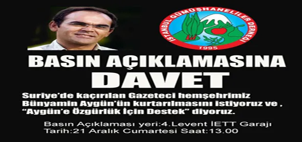 İstanbul Gümüşhaneliler Derneği Suriye’de terörist gruplarca kaçırılan Gazeteci Bünyamin Aygün’ün son akıbetiyle ilgili olarak bir basın açıklaması yapacak