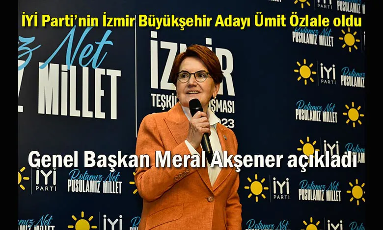 İYİ Parti Genel Başkanı Meral Akşener, İzmir'de bir otelde düzenlenen teşkilat buluşmasında konuşurken, İYİ Parti İzmir Milletvekili ve Kalkınma Politikaları Başkanı Ümit Özlale'nin, İzmir Büyükşehir Belediye Başkanı Adayı olduğunu açıkladı.