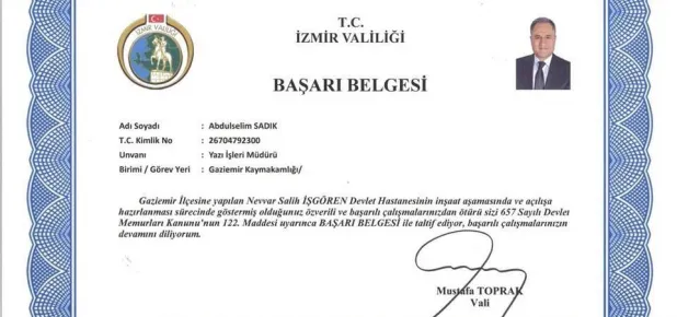 İzmir’in Gaziemir ilçesine kazandırılan devlet hastanesinin hizmete girmesinde büyük emek sarfeden, katkılarını esirgemeyen Gaziemir Kaymakamlığı Yazı İşleri Müdürü Selim Sadık’ı göstermiş olduğu üstün gayretten dolayı Vali Mustafa Toprak teşekkür belgesiyle ödüllendirdi.