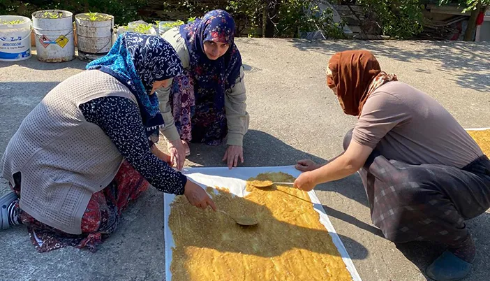 30 yılı aşkın süredir pestil üreten Tekke beldesinden Sakine Demirkıran, “Herle pişmezse pestil çıkmaz. Kalın pestil kuruyamaz, ince pestil bezden ayrılmaz” diyerek işin püf noktalarını aktardı.