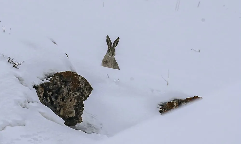 Gümüşhane'de kış, tüm zorluklarına rağmen göz kamaştıran güzellikleri de beraberinde getiriyor. Son günlerde etkili olan kar yağışı, yüksek kesimlerde beyaz örtüyü kalınlaştırırken, bir yaban hayvanı objektiflere takıldı. Karlar arasında zıplaya zıplaya ilerleyen bir tavşan, adeta kışın ortasında yaşam mücadelesini simgeledi.