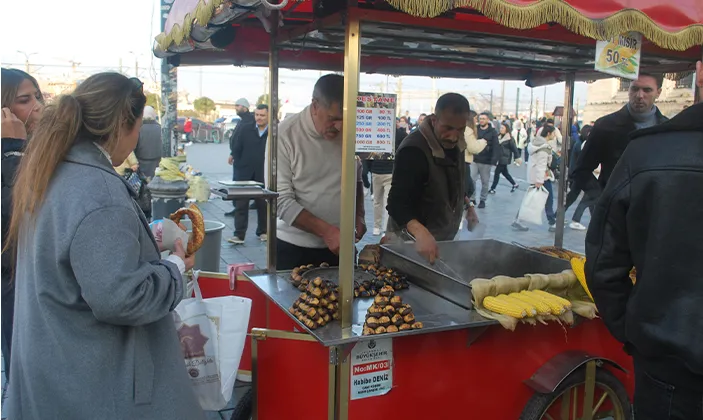 Mısır Çarşısı’nın önünde kestane ve mısır satan bir esnafın tezgahında fiyatlar dikkat çekiyor. 100 gram kestane tam 80 TL, mısır ise tanesi oldukça yüksek bir fiyata satılıyor. Bu fiyatlar, özellikle orta direk vatandaşın alım gücünü zorlarken, esnaf da iş hacminin düşüklüğünden şikayetçi.