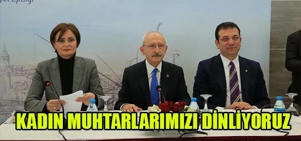 Cumhuriyet Halk Partisi (CHP) Genel Başkanı Kemal Kılıçdaroğlu, CHP İstanbul İl Başkanı Canan Kaftancıoğlu ve İstanbul Büyükşehir Belediye (İBB) Başkanı Ekrem İmamoğlu, “Kadın Muhtarlarımızı Dinliyoruz” toplantısında bir araya geldi. Yenikapı’daki Avrasya Gösteri ve Sanat Merkezi’nde gerçekleştirilen etkinliğe, İstanbul’da görev yapan 140 kadın muhtar katıldı. Kılıçdaroğlu, Kaftancıoğlu ile İmamoğlu, toplantının yapılacağı salona, birlikte ve alkışlar eşliğinde girdi. Etkinlikte ilk konuşmayı Kaftancıoğlu yaptı. Demokrasinin tecelli ettiği ilk yerin muhtarlıklar olduğunu belirten Kaftancıoğlu, “Sizlerin tecrübe, tespit ve önerileri, genel ve yerelde tespit yapan tüm siyasetçiler için yol gösterici olmalı. Mahallerinizde yaptığınız çalışmaları dikkatle takip ediyoruz. Sizlerin kısa ve uzun vadedeki çalışmalarınızı hayata geçirmeyi umuyoruz. Halkın ilk umudusunuz, çözüm odağısınız ve dert ortağısınız” dedi.