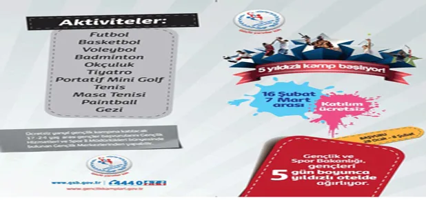 Gençlik ve Spor Bakanlığı, Gençlik Hizmetleri Genel Müdürlüğünün 2013 yılı faaliyet programı çerçevesinde, gençlerin serbest zamanlarını çeşitli sosyal, kültürel ve sportif faaliyetleri değerlendirmelerini sağlamak amacıyla düzenlenen gençlik kamplarına daha fazla gencin katılımını sağlamak amacıyla 16 Şubat - 07 Mart 2013 tarihlerinde Antalya’ da Kış Dönemi Gençlik Kampı açılacaktır.