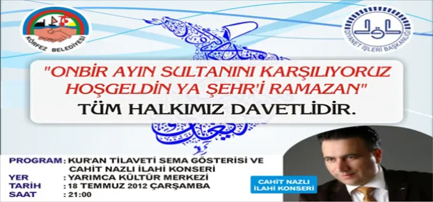 Ramazan ayının arifesinde Körfez Belediyesi ve Körfez Müftülüğü’nün birlikte düzenlediği “On Bir Ayın Sultanını Karşılıyoruz Hoş geldin Ya Şehr’i Ramazan” programı 18 Temmuz 2012 Çarşamba günü saat 21:00 da Körfez Belediyesi Yarımca Kültür Merkezinde gerçekleşecek.Programda Kur’an Tilaveti,Sema gösterisi ve Cahit Nazlı ilahi konseri yer alacak.