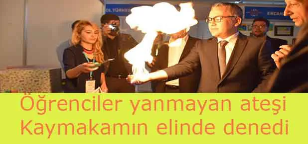 Üç gün sürecek “2. Bilim, Kültür Sanat Şenlikleri”nde dikkat çeken çalışmalar arasında Fatma Gözen Eralp Ortaokulu öğrencilerinin yaptığı “Yanmayan Eller” yer aldı. Standı gezen Kaymakam Yılmaz Şimşek’in eline yanmayan sıvı süren ardından da ateşe veren öğrencilerin gösterisi hem korkuttu hem de şaşırttı. Birkaç saniyeliğine eli tutuşan ancak özel sıvı sayesinde ateşi hissetmeyen Kaymakam Şimşek, gösterinin ardından öğrencilere teşekkür etti.