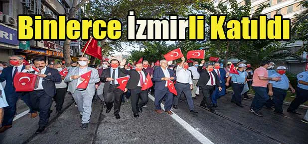İzmir Büyükşehir Belediyesi bandosu eşliğinde marşlarla ilerleyen kortejde 350 metrelik dev Türk bayrağı taşındı. İzmir Büyükşehir Belediye Başkanı Tunç Soyer, yürüyüş boyunca yurttaşları selamladı. Ellerinde Türk bayraklarıyla yürüyen kalabalık, Lozan Meydanı’nda yürüyüşü sonlandırdı.