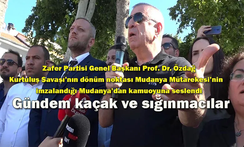 Zafer Partisi Genel Başkanı Prof. Dr. Ümit Özdağ, sığınmacı ve kaçakların sahillerimizde verdiği huzursuzluğa dikkat çekmek ve vatandaşlarımızdan gelen şikayetleri kamuoyuna duyurmak adına Mudanya Mütareke Meydanında basın açıklaması yaptı: