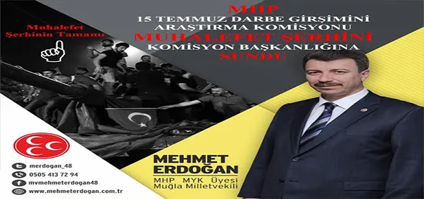 MHP Muğla Milletvekili Mehmet Erdoğan Milliyetçi Hareket Partisi 15 Temmuz Fethullahçı Terör Örgütünün (FETÖ/PDY) 15 Temmuz 2016 tarihli darbe girişimi ile bu terör örgütünün faaliyetlerinin tüm yönleriyle araştırılarak alınması gereken önlemlerin belirlenmesi amacıyla kurulan meclis araştırması komisyonu raporuna muhalefet şerhini açıkladı