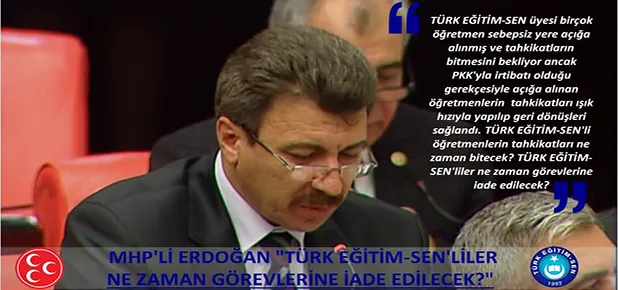 MHP MYK Üyesi ve Muğla Milletvekili Mehmet Erdoğan TBMM’de devam eden 2017 Bütçe Görüşmelerinde Milli Eğitim Bakanı İsmet Yılmaz’a FETÖ soruşturmaları kapsamında tahkikatları yapılmak üzere açığa alınan ve hala göreve iade edilmeyen Türk Eğitim-Sen üyesi öğretmenlerin durumunu sordu.