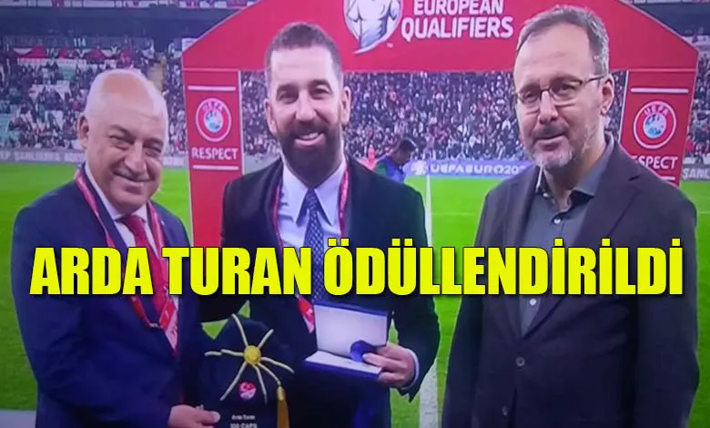 Milli Formayı tam 100 kez giyme başarısı gösteren Eski Milli Futbolcu Arda Turan ödülünü Futbol Federasyonu Başkanı Mehmet Büyükekşi ve Gençlik ve Spor Bakanı Mehmet Müezzin Kasapoğlu’nun elinden Bursa’da oynanan Türkiye Hırvatistan Euro 024 Grup elemeleri müsabakası öncesi aldı.