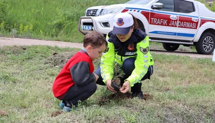 Etkinlik kapsamında her öğrenci adına hazırlanan çam fidanları, çocuklarla birlikte İl Jandarma Komutanlığı bahçesine dikildi. Bu anlamlı etkinlik ile çocuklara doğa ve ağaç sevgisi aşılandı.
