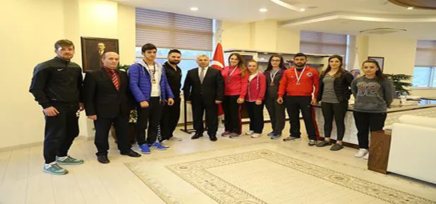 Üniversiteler Türkiye Kick Boks Şampiyonası’nda ödül alan sporcular Gümüşhane Üniversitesi Rektörü Prof. Dr. İhsan Günaydın’ı makamında ziyaret etti