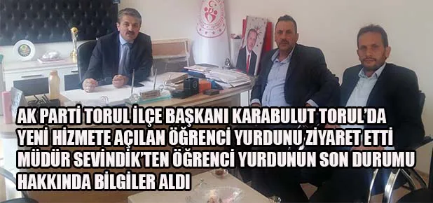 AK Parti Torul ilçe Başkanı Osman Karabulut beraberinde Yönetim Kurulu Üyesi Behzat Üçüncüoğlu, Atalar Köyü Muhtarı Yılmaz Ünlü ile birlikte 2019 2020 Eğitim Öğretim yılında hizmete giren Torul Meslek Yüksekokulu KYK öğrenci yurdunu ziyaret etti.