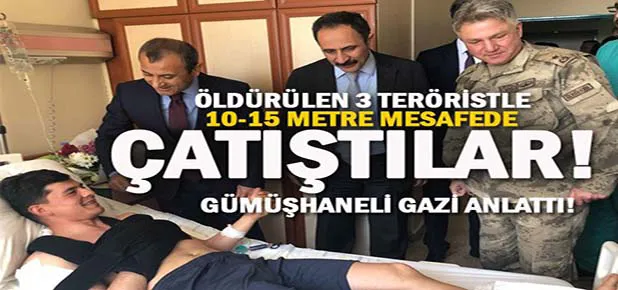 10 - 15 metre mesafede çatışma Ziyarette kahraman gazi Kartal, "10 - 15 metre mesafede benim önümde bir kaya vardı, teröristin önünde bir kaya bloğu vardı. İlk önce aşağıdan gideni gördük, arkadaş kaya bloğuna geçerken o attı, beni görmedi zaten. O atınca ben ona attım kadın düştü zaten, bağırıyordu. El bombası attım kadın sustu, arkadaşın yanına geçtim. El bombası attım diğeri de havaya sıçrayıp düşmüş, yakın mesafeydi obürü de bize bir kaç tane el bombası attı, 10 - 15 metre mesafeydi" diyerek olay anını anlattı.