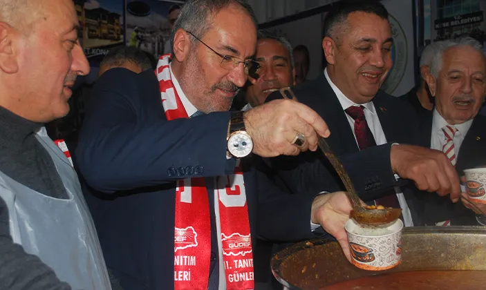 Stant etrafını çevreleyen Gümüşhaneliler dev tencerede bulunan fasulyeyi kısa sürede tükettiler.