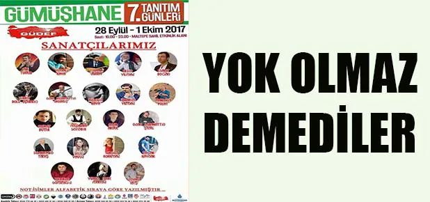 İşte Gümüşhane 7. Tanıtım günleri yer İstanbul, Maltepe, anlaşılan federasyon yönetimi bu kez ciddi yerinde bir karar alarak tam 22 sanatçıyı beş gün boyunca hemşerileriyle buluşturacak. Torul, Kürtün, Kelkit, Şiran, Gümüşhane, Köse’nin sesi Maltepe’den yükselecek varsın o milyarları yığdığımız sanatçı da olmasın, bizim değerlerimiz bize yeter. Haklarını teslim edelim, onlar bunca haksızlığa rağmen olmaz demedi, gelmem demedi. Alkışlarınızı, ilginizi bu isimlerin hakkını 28 Eylüle sonu 1 Ekim’e saklayın; olmaz mı?