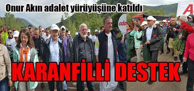 CHP Genel Başkanı Kemal Kılıçdaroğlu’nun başlattığı adalet yürüyüşünün Kızılcahamam mevkinde sanatçı Onur Akın yüzlerce karanfil dağıttı. Adalet yürüyüşüne destek amaçlı İstanbul Maçka Parkı’ndaki ‘Adalet Nöbeti’nde de geçtiğimiz günlerde bir konser veren sanatçı bugün şarkıları ve karanfilleri ile yürüyüşe katıldı. Yürüyüş sırasında sözleri Vedat Türkali’ye bestesi de Onur Akın’a ait olan ‘bekle bizi İstanbul’ şarkısı söylendi.