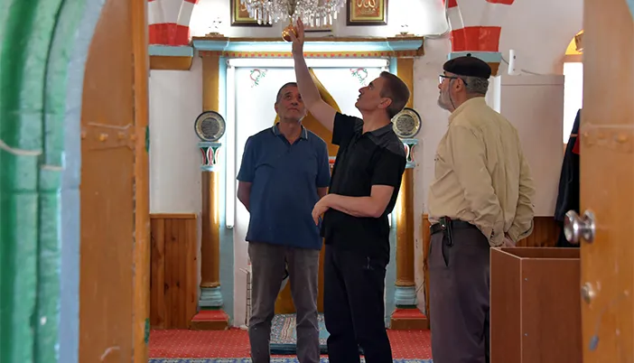 Ziyaretin ikinci durağı olan Güzeloluk Köyü’nde 1882 yılında yapıldığı bilinen Osmanlı dönemi eseri tarihi Güzeloluk Camisi’ni inceleyen Vali Baruş, caminin tarihi dokusu ve köyde yürütülen dere ıslah çalışmaları hakkında yetkililerden bilgi aldı.