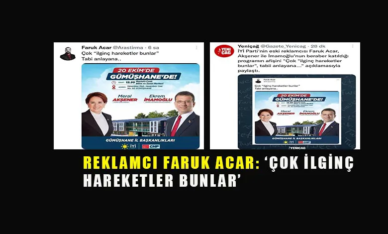Acar’ın tweetini alıntılayan Akşener’e yakınlığı ile bilinen Yeniçağ Gazetesi’nin internet sayfası da ‘’İYİ Parti'nin eski reklamcısı Faruk Acar, Akşener ile İmamoğlu'nun beraber katıldığı programın afişini "Çok "ilginç hareketler bunlar", tabii anlayana..." açıklamasını sayfasına taşıdı