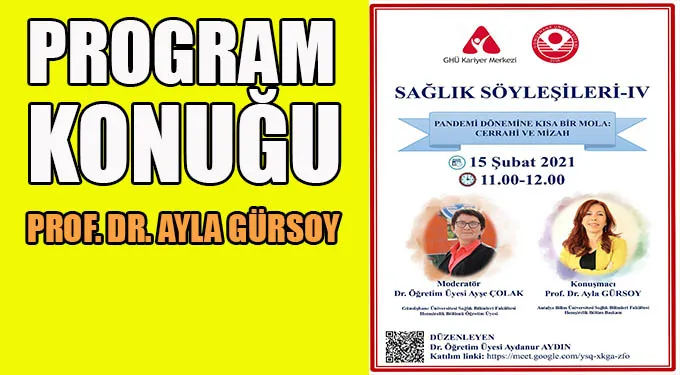 “Pandemi Dönemine Kısa Bir Mola: Cerrahi ve Mizah” konulu etkinliğin moderatörlüğünü GÜ’si Sağlık Bilimleri Fakültesi Hemşirelik Bölümü Dr. Öğr. Üyesi Ayşe Çolak üstlenecek. Etkinliğe konuk katılımcı olarak Antalya Bilim Üniversitesi Sağlık Bilimleri Fakültesi Hemşirelik Bölüm Başkanı Prof. Dr. Ayla Gürsoy katılacak.