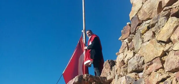 Torul Kalesinde asılı bulunan Türk Bayrağına gözü gibi bakan Küçüköner, eskiyen bayrağın değişimini metrelerce yüksekliğe aldırmadan bizzat yapıyor.