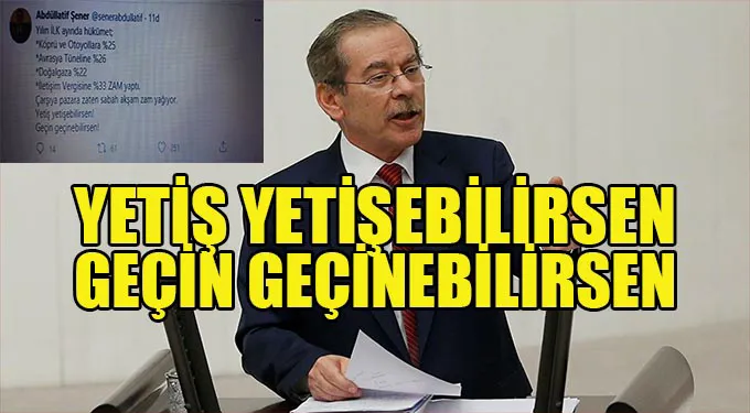 GÜMÜŞHANE / GÜNDOĞUMU CHP Konya Milletvekili Abdüllatif Şener, yağmur gibi yağan zamların ardından hükümeti topa tuttu. Köprü ve otoyoldan, iletişime kadar adeta herşeye zam yağdıran Hükümeti sert sözlerle eleştiren Şener, twitter'dan yaptığı açıklama da; 'Yılın İLK ayında hükümet; *Köprü ve Otoyollara %25, *Avrasya Tüneline %26, *Doğalgaza %22, *İletişim Vergisine %33 ZAM yaptı. Çarşıya pazara zaten sabah akşam zam yağıyor. Yetiş yetişebilirsen!, Geçin geçinebilirsen!' diye yazdı.