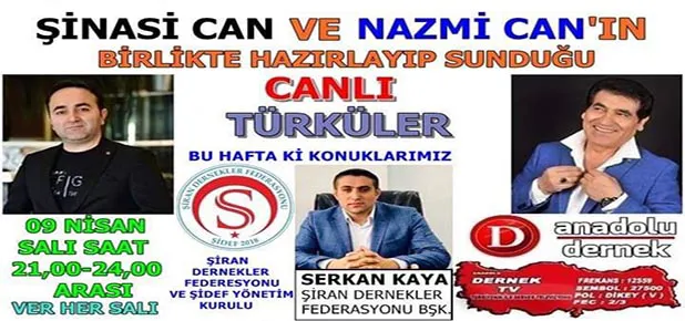 Şinasi Can ve Nazmi Can’ın birlikte sunduğu Canlı Türküler programına bu hafta Şiran Dernekler Federasyonu Genel Başkanı Serkan Kaya ve Yönetim Kurulu konuk oluyor.