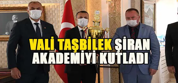 GÜMÜŞHANE / GÜNDOĞUMU Şiran Akademispor, Gümüşhane Valisi Kamuran Taşbilek'i ziyaret etti. Kulüp Başkanı Ersin Şahin ve yönetim kurulu üyelerinin yer aldığı ziyarette şampiyonluk kupası Vali Taşbilek'e sunuldu, Vali Taşbilek ayrıca kulüp yönetimi tarafından Şiran oynanacak karşılaşmaları izlemeye davet edildi.