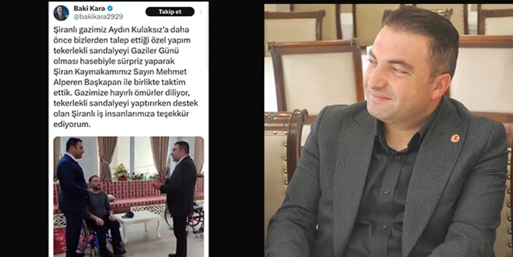 ‘’Şiranlı gazimiz Aydın Kulaksız'a daha önce bizlerden talep ettiği özel yapım tekerlekli sandalyeyi Gaziler Günü olması hasebiyle sürpriz yaparak Şiran Kaymakamımız Sayın Mehmet Alperen Başkapan ile birlikte taktim ettik. Gazimize hayırlı ömürler diliyor, tekerlekli sandalyeyi yaptırırken destek olan Şiranlı iş insanlarımıza teşekkür ediyorum’’. Dedi.