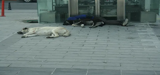 Hemen yanıbaşında uyuyan bu sokak köpeği de adeta Taksim ruhunun görüntüsünü sergiliyor.