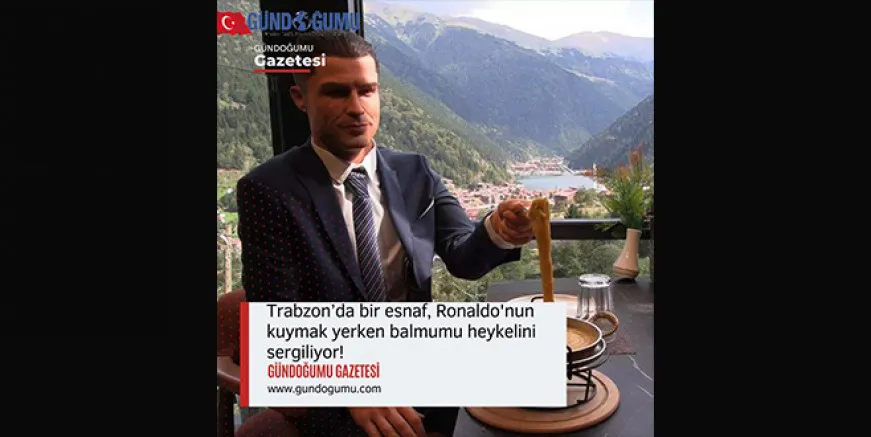 Çaykara’da işletme sahibi bir esnaf dünyaca ünlü oyuncu Ronaldo’nun kuymak yiyen Uzungöl’e nazır balmumu heykelini işyerine kazandırmış.