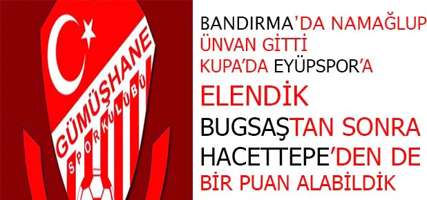 Bandırma deplasmanında namağlup ünvanını yitiren kırmızı beyazlılar, Türkiye Kupası mücadelesinde Eyüpspor’a farklı mağlup olarak elendi. Temsilcimiz kupanın ardından Ankara deplasmanında da iyi bir görüntü vermedi ve Bugsaş’tan bir puan alabildi. Haftayı Şanlıurfaspor’un Bandırma’ya mağlup olmasıyla lider kapatan Gümüşhanespor, Bayburt’ta konuk ettiği Hacettepe karşısında bir puanla yetindi.