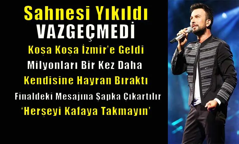 Dev konser öncesi sahnesi yıkılan Tarkan vazgeçmedi koşa koşa İzmir’e gelerek bu büyük güne ortak oldu, İzmirlileri coşturdu.