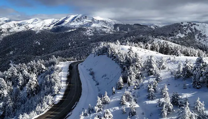 Ladin ve çam ağaçlarının karla kaplanan dalları, dik rampalar, keskin virajlar ve sisle birleşince ortaya görsel bir şölen çıktı. Havadan drone ile görüntülenen geçitte, kıvrımlı yollar boyunca ilerleyen araçlar kışın tüm sertliğini ve güzelliğini aynı karede buluşturdu.