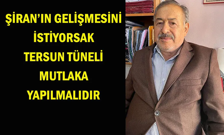 ‘Son dönemde ilçemiz hepimiz adına ifade edebiliriz ki yeteri kadar hizmetle buluşturulamamştır. Tersun Dağı tünelinin ise yine uzun yıllardan beri Şiran için büyük bir ihtiyaç olduğunu her fırsatta söylüyoruz. Biz Şiran’ın gelişmesini istiyorsak tünel mutlaka yapılmalıdır. Tersun Dağı tünelinin ihtiyaç olduğunu yıllardan beri ifade ediyoruz bu çağrı mutlaka dikkate alınmalıdır. Özellikle ulaşım noktasında olumlu icraat yapan iktidarın büyük teveccüh görmüş Gümüşhane’den bu yatırımı bir muhalefet partisi başkanı olarak esirgememesi kanaatindeyim. Gerçekten çok büyük bir yatırım olarak duran Tersun; belki de yeni Zigana’dan sonra bu bölgeye gelecek en büyük hizmet olacaktır. Bu bölgenin trafik akışı, Şiran’ın konumu, mevcut yerleşim alanları ile bağlantıları, Gümüşhane açısından konumu dikkate alınırsa ısrarımızın nedeni, tazyiki çok daha fazla anlaşılacaktır, bugüne değin bu konunun neden umursanmadığını sorusuna da yanıt beklemekteyiz. Tekrar ediyoruz ki, Tersun ekmek gibi su gibi Şiran’a Gümüşhane’ye gereklidir ve bu bölgeden esirgenmemelidir’’