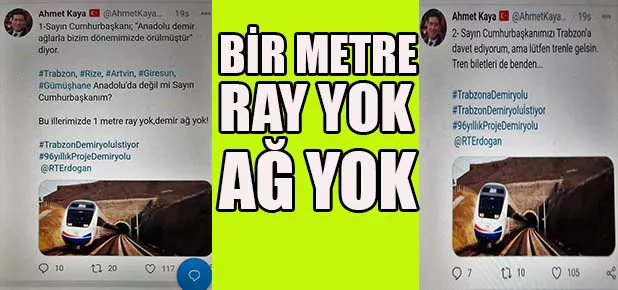 Cumhurbaşkanının ifadelerine sosyal medya hesabından cevap veren CHP’li Kaya’nın ‘’Trabzon, Rize, Artvin, Giresun, Gümüşhane Anadolu’da değil mi Sayın Cumhurbaşkanım, bu illerimizde ray yok, demir ağ yok’’ sözleri dikkat çekti.