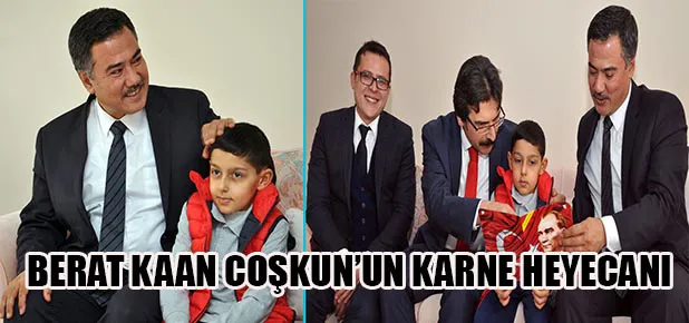 Evde karne heyecanı yaşayan Coşkun’un karnesini İl Milli Eğitim Müdürü Seydi Doğan, Müdür Yardımcısı Mesut Olgun verdi.