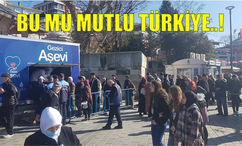 Üsküdar Meydanına kurulan İBB Aşevi önünde oluşan metrelerce kuyruk Türkiye Yüzyılında ekonominin geldiği durumu gözler önüne serdi.
