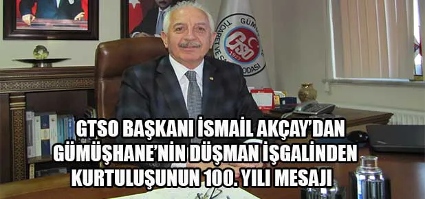 Gümüşhane Ticaret ve Sanayi Odası(GTSO) Yönetim Kurulu Başkanı İsmail Akçay; şehrimizin düşman işgalinden kurtuluşunun 100. yıl dönümünü kutlayarak Türk milleti ve Türkiye Cumhuriyeti üzerinde gizli planlar yapanların her zaman olduğu gibi yine gerektiği dersi alacağını söyledi.