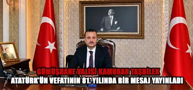 Gümüşhane Valisi Kamuran Taşbilek Türkiye Cumhuriyetinin Kurucusu, Ebedi Başkomutan, Ulu Önder Gazi Mustafa Kemal Atatürk’ün vefatının 81. Yıldönümü nedeniyle bir mesaj yayınladı