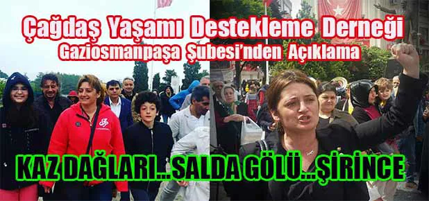 ÇYDD Gaziosmanpaşa Şubesi, ülkemizde son günlerde yaşanan doğa katliamlarına, yayınladığı bir basın açıklaması ile tepki gösterdi. "Vatanımızın doğası ranta kurban verilemez" başlığı ile yayımlanan açıklamada şu ifadelere yer verildi: "Büyük Atatürk'ün ağacı kesmemek için inşaatın yerini değiştirdiği duyarlılığa sahip bir ulus olarak, son günlerde vatanımızın cennet köşelerinde gerçekleştirilen doğa katliamlarına seyirci kalmamız mümkün değildir. Çünkü bizler, doğayı korumanın aslında vatanı korumak olduğunu çok iyi bilmekteyiz. Bu bilinçle, (Ege Bölgesi) Kaz Dağları’nda, (Burdur) Salda Gölü’nde ve (İzmir) Şirince'deki katliamlara karşı yüreğini ortaya koyan ÇYDD Şubelerimiz de mücadele vermektedirler. Gaziosmanpaşa Şubesi olarak biz de doğa katliamlarına karşı vatan savunması saydığımız bu kutsal mücadelenin sonuna kadar destekçisi olacağımızı bildirir, kararlılığımızı kamuoyunun bilgisine sunarız"