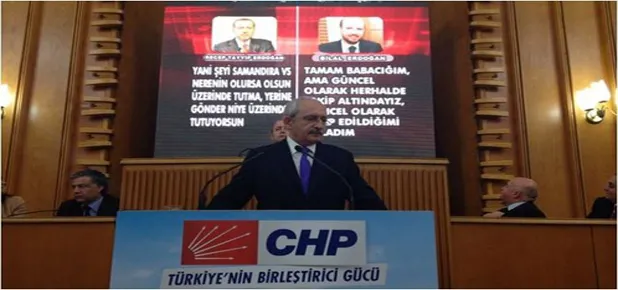 CHP lideri Kemal Kılıçdaroğlu, Başbakan Tayyip Erdoğan’ın oğlu Bilal Erdoğan arasında geçtiği iddia edilen ve “paraları sıfırla” talimatı verdiği ses kayıtlarını partisinin grup toplantısında dinletti. Kayıtları yargı dahil resmi ve gayri resmi kanallardan doğrulattırdıklarını belirten CHP lideri, “Ağrı Dağı ne kadar gerçekse, Erciyes Dağı ne kadar gerçekse, bu kayıtlar, tutanaklar da o kadar gerçek” dedi. Erdoğan’ın artık “Başbakanlık yapamayacağını” ve bu kayıtların arkasının da geleceğini belirten Kılıçdaroğlu, “Paraları kamyonlarla götürüyorsun. Yarın öbür gün yeni şeyler de çıkar. Ya atla helikoptere yurtdışına kaç, ya da istifa et” çağrısı yaptı. Konuşma kayıtlarının yayımlandığı sırada ulusal haber kanallarının yanı sıra grup toplantılarını yayımlamakla yükümlü olan Meclis TV, yayını keserek “tapelere sansür” uyguladı.