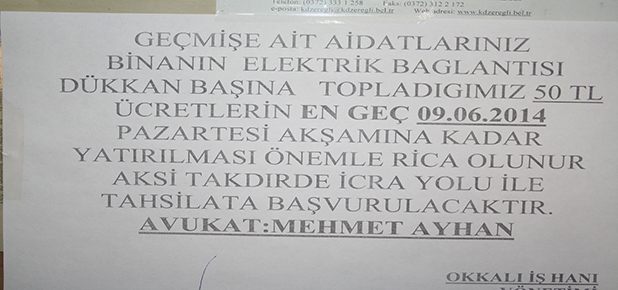 İş yeri yönetimi özellikle aidat noktasında işyeri sahiplerini uyarırken 50 TL gibi bir rakamın dahi icra yolula tahsil edileceğinin altı çiziliyor.